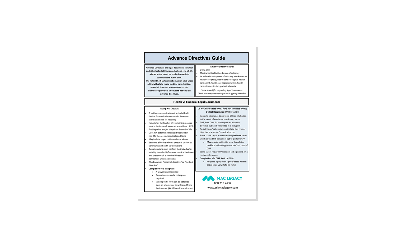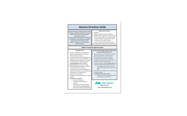 The Advance Directives Guide explores the various legal documents many adults need as part of their planning for the future. Information is provided on the differences between advance directives and other legal documents. A quiz is included to test the knowledge of you and your staff. One download per digital purchase.
