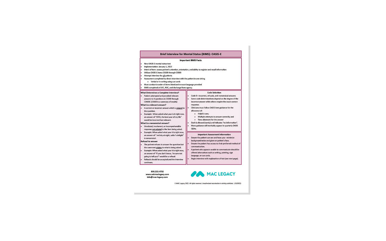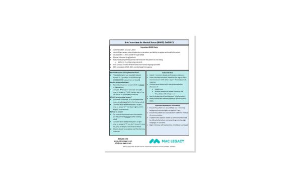 The Brief Interview for Mental Status is a new cognitive assessment tool included in OASIS-E. This cheat sheet provides step-by-step clinician assessment guidance with exact language required of the interviewer. Cue cards are provided for written administration of the test. One digital download per purchase.