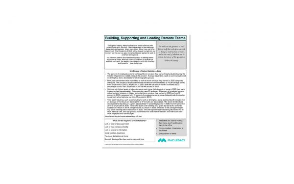 Due to the COVID-19 pandemic in 2020, the percent of employed persons working at home nearly doubled – rising to 42%. This development has created a “new normal” to which we must adapt! Adapting means becoming more flexible and creative. This cheat sheet offers tips and suggestions to continue to run your business, write your policies and retain the best employees. One digital download per purchase.