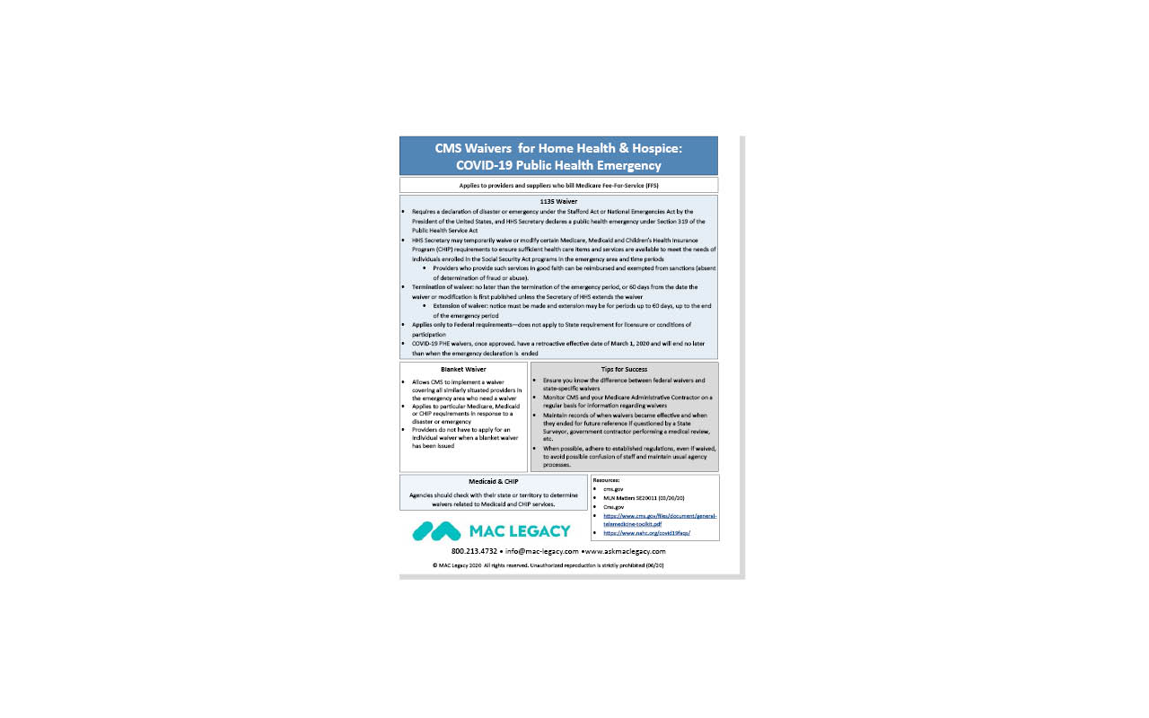 This waiver cheat sheet has home health and hospice-specific waivers established during the COVID-19 Public Health Emergency. Virtually all waivers have a reference to the regulation and guidance as to which agency department is affected.