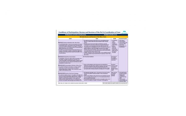 This cheat sheet focuses on the Review and Revision of the Plan of Care CoP 484.60(c) and Coordination of Care CoP 484.60(d). These topics interpret required physician, caregiver and patient communication regarding the patient’s health status, education and care plan. One digital download per purchase.
