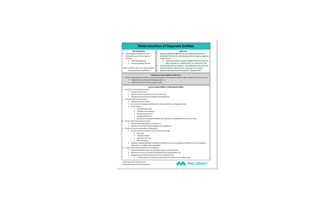 Texas home health agencies who are both certified and licensed must be aware of the determination of separate entities rule in order to understand applicable rules and regulations. This includes the Personal Assistance Services service lines which may be tied organizationally to the HHA certification. This tool will help organizations understand separate entities and help avoid survey citations. One download per digital purchase.
