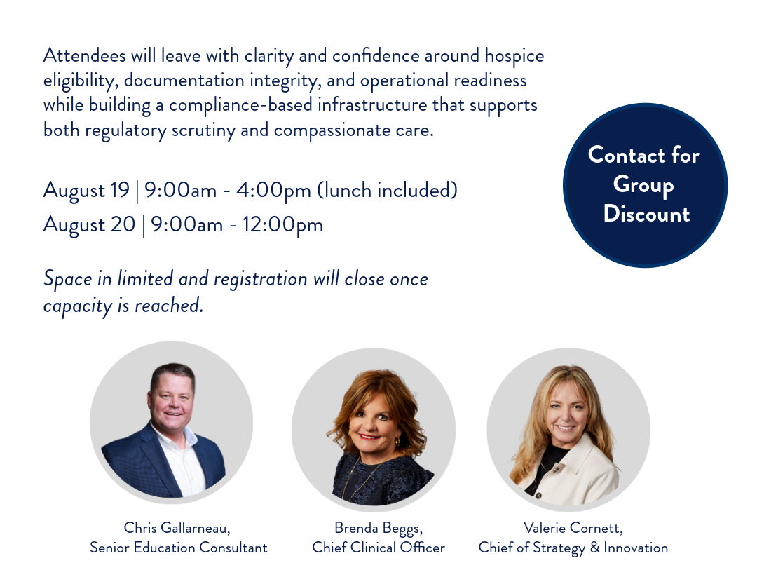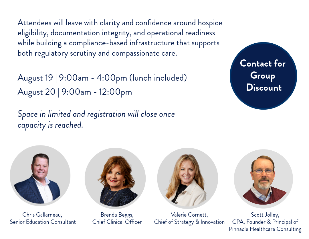 This is an exclusive hospice intensive designed for owners, senior leaders and clinical managers who want more than surface‑level compliance education. This in person workshop offers rare access to practical frameworks, real‑world tools, and expert insight typically reserved for private consulting engagements.