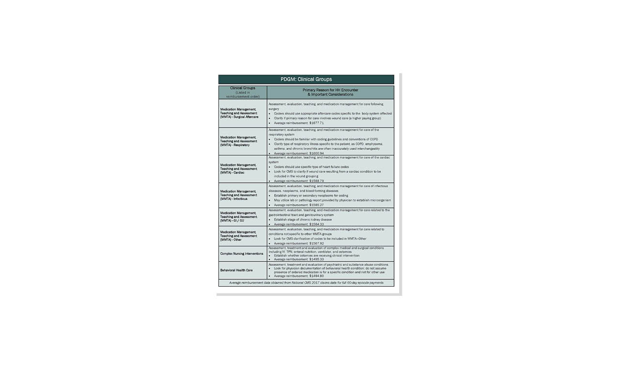 Clinical groups is an important aspect of the establishment of the Medicare home health patient’s reimbursement under Patient Driven Groupings Model (PDGM). This cheat sheet describes the groupings under PDGM and expected reimbursement for each group with important tips on coding to ensure accurate reimbursement. One digital download per purchase.